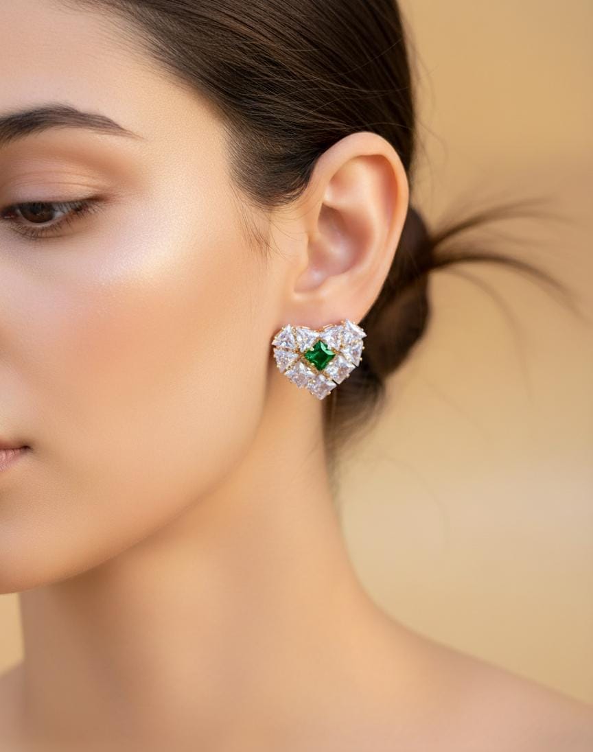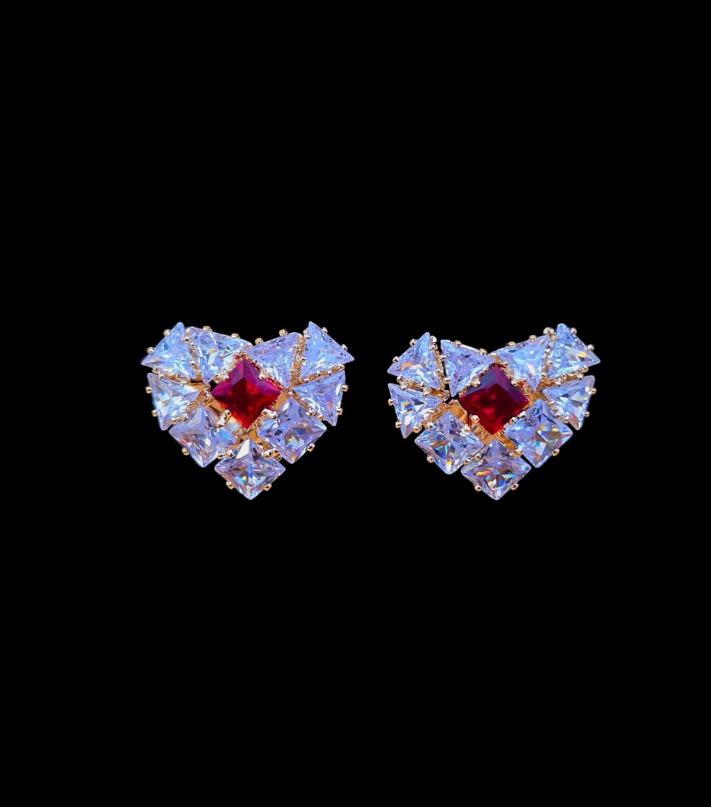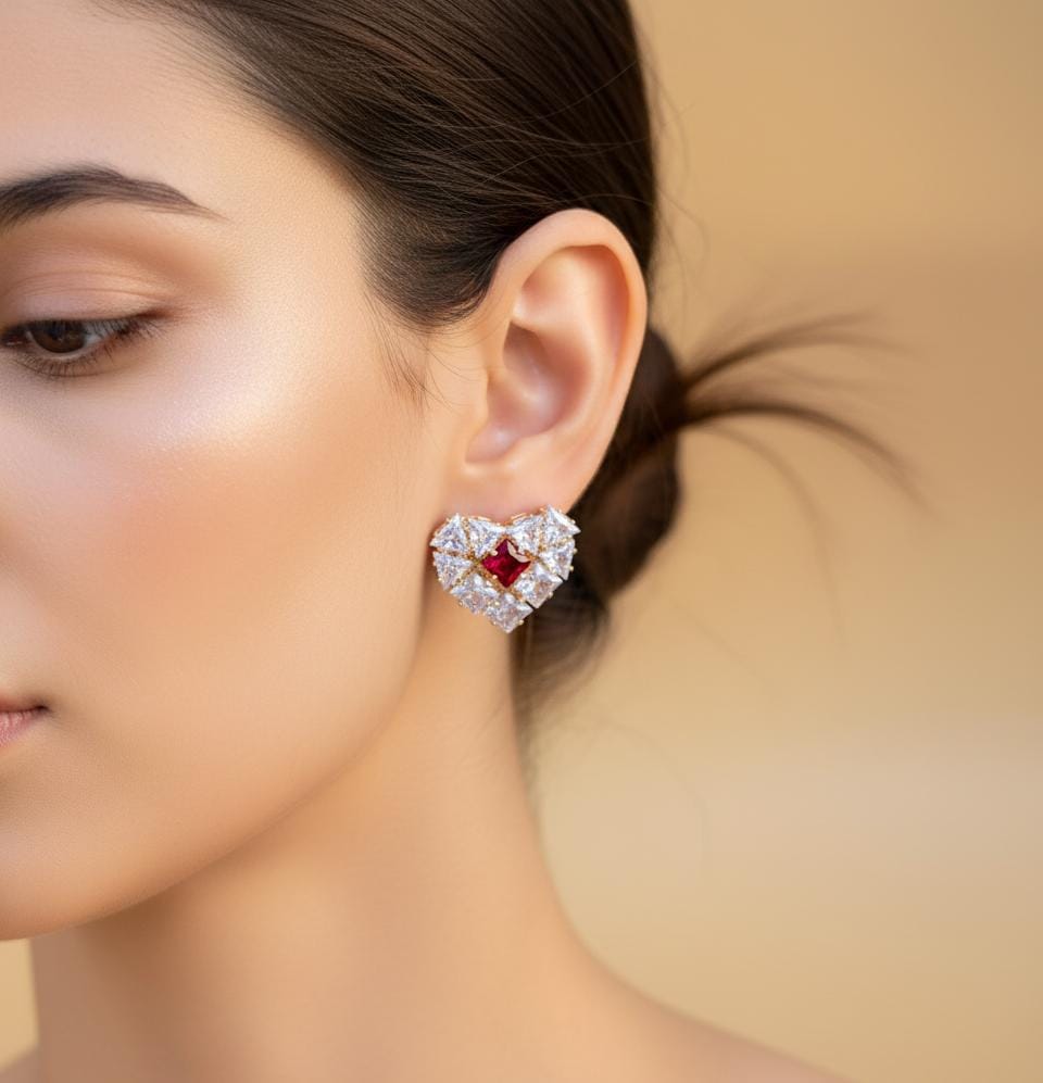 Each stud features a breathtaking central heart-cut gem—a symbol of the deep, beautiful love you hold or cherish. This vibrant heart is embraced by a radiant cluster of smaller stones, designed to catch the light and reflect the joy and passion that warms your soul.