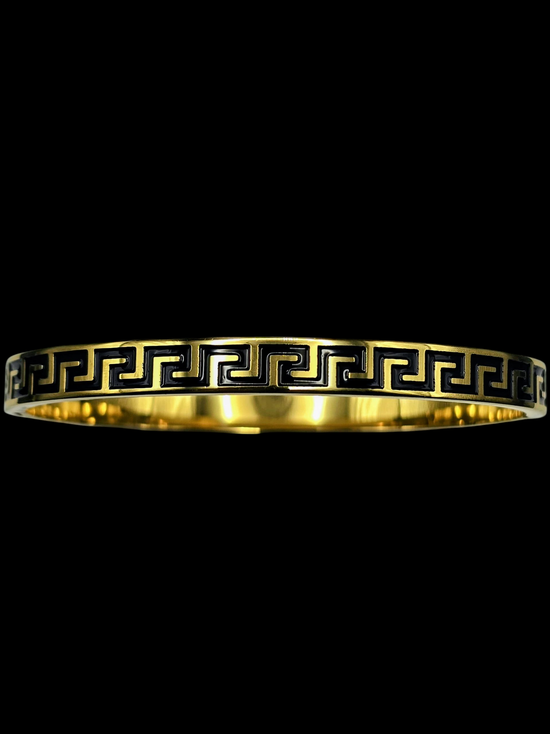 The Odyssey Cuff features the legendary Greek Key, or Meander, a continuous, interlocking pattern that symbolizes infinity, unity, and the ebb and flow of fate. Set against a rich gold base, the deep black enamel highlights this ancient motif, creating a bold contrast that speaks of strength and conviction.