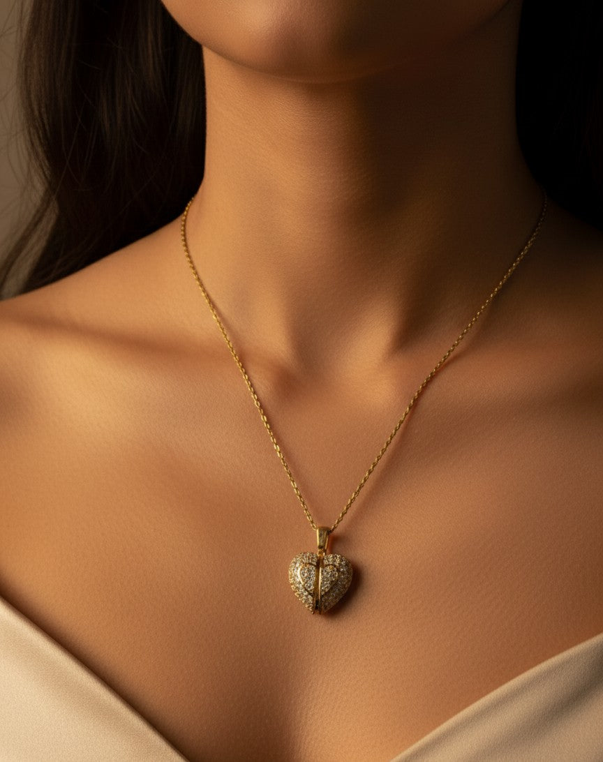 This is a piece designed to safeguard your most cherished emotion. The Precious Love necklace features a breathtaking, shimmering heart pendant dusted with bright crystals, symbolizing the radiant, powerful love you carry. With a gentle touch, the pendant opens, revealing a smooth, polished heart hidden within—a private space for your most treasured feelings.