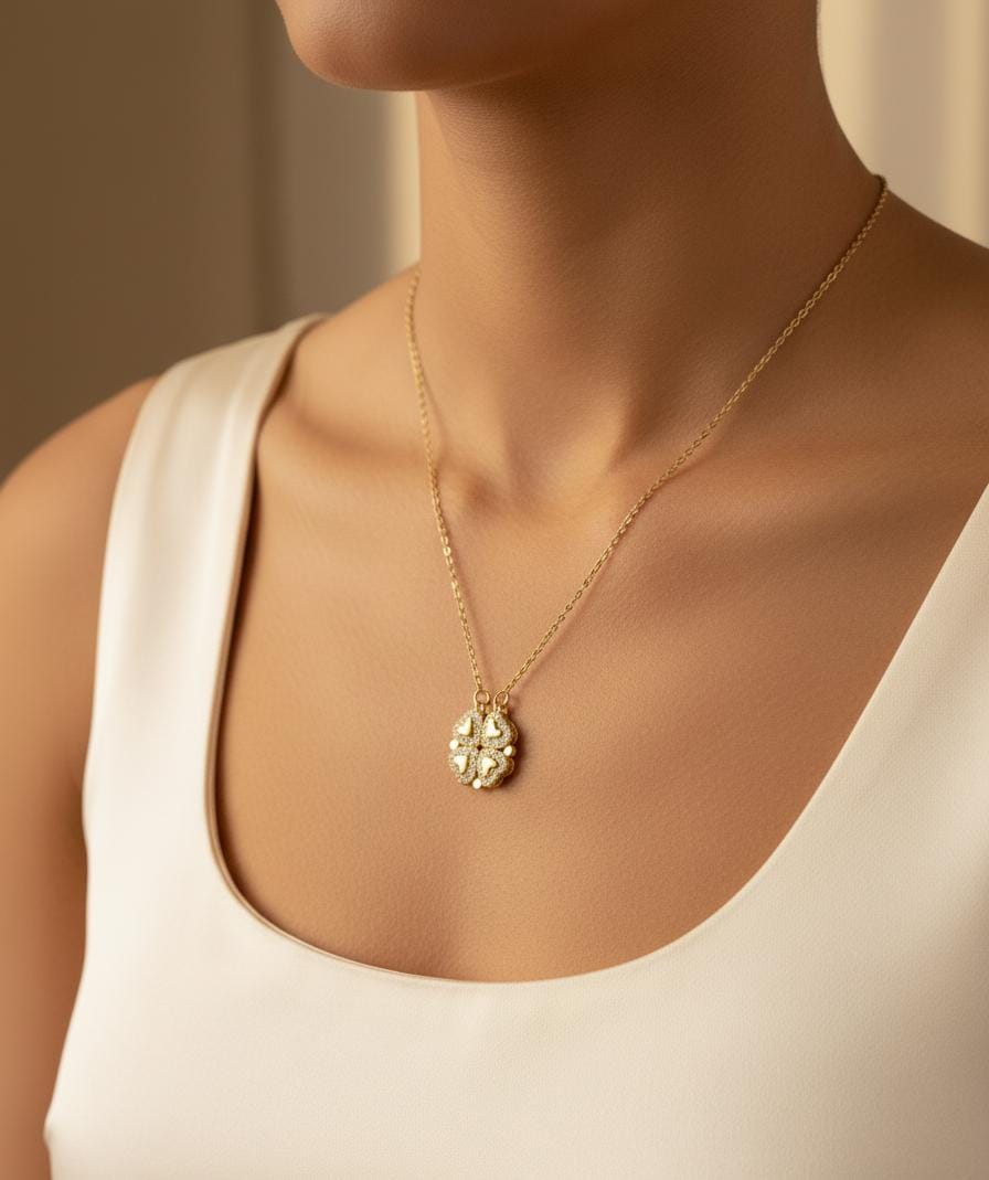 When worn as a single piece, four shimmering hearts elegantly gather to form a perfect four-leaf clover, representing the hidden and profound faith you carry. With a gentle touch, the pendant can separate into four individual hearts, a constant, beautiful reminder of the connections that define you.