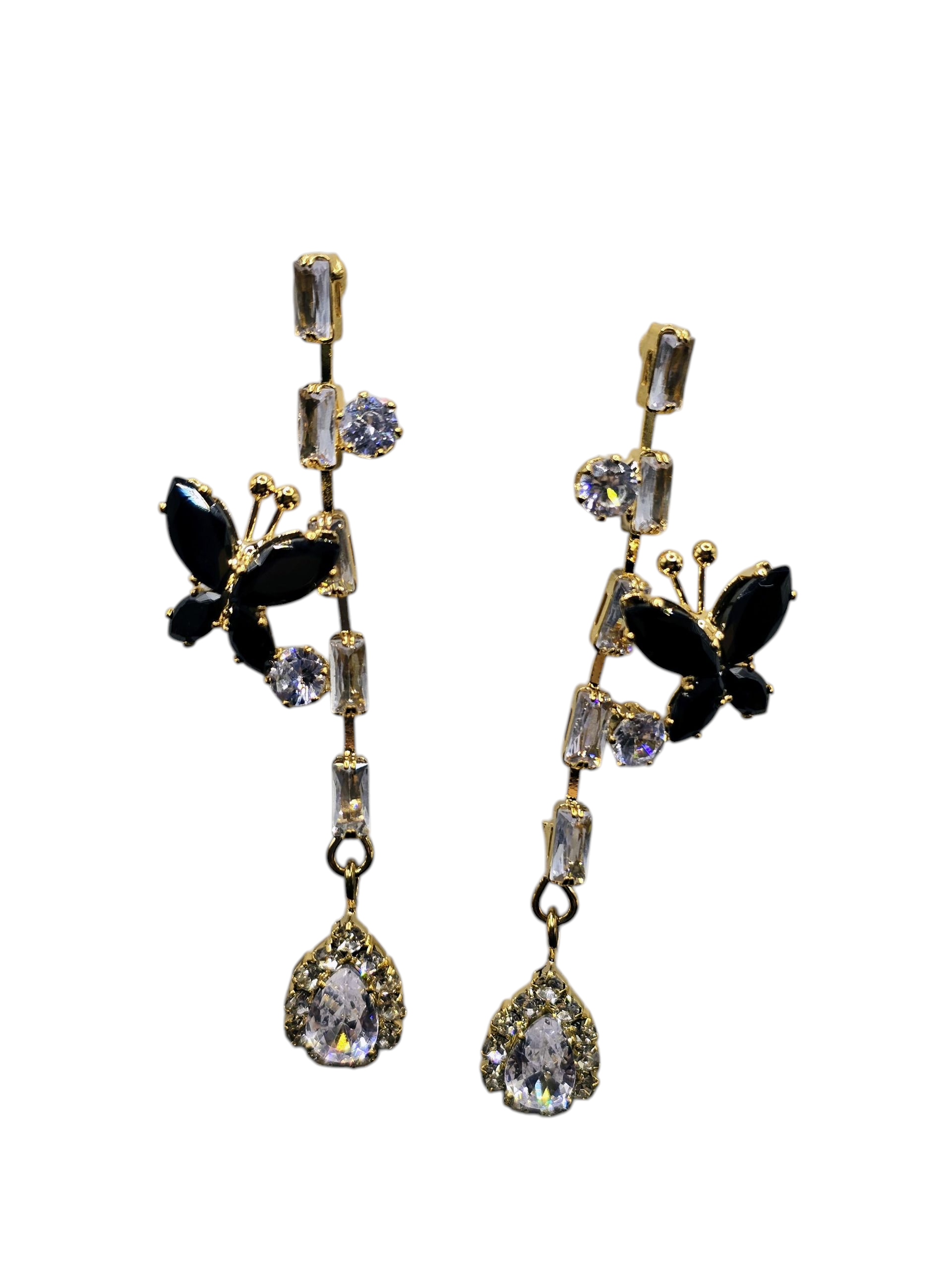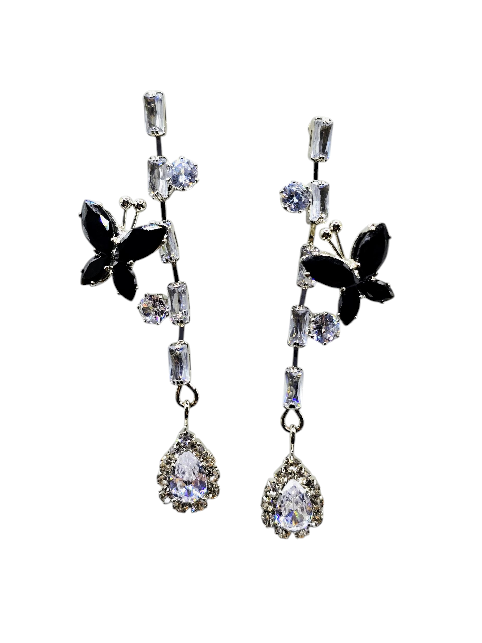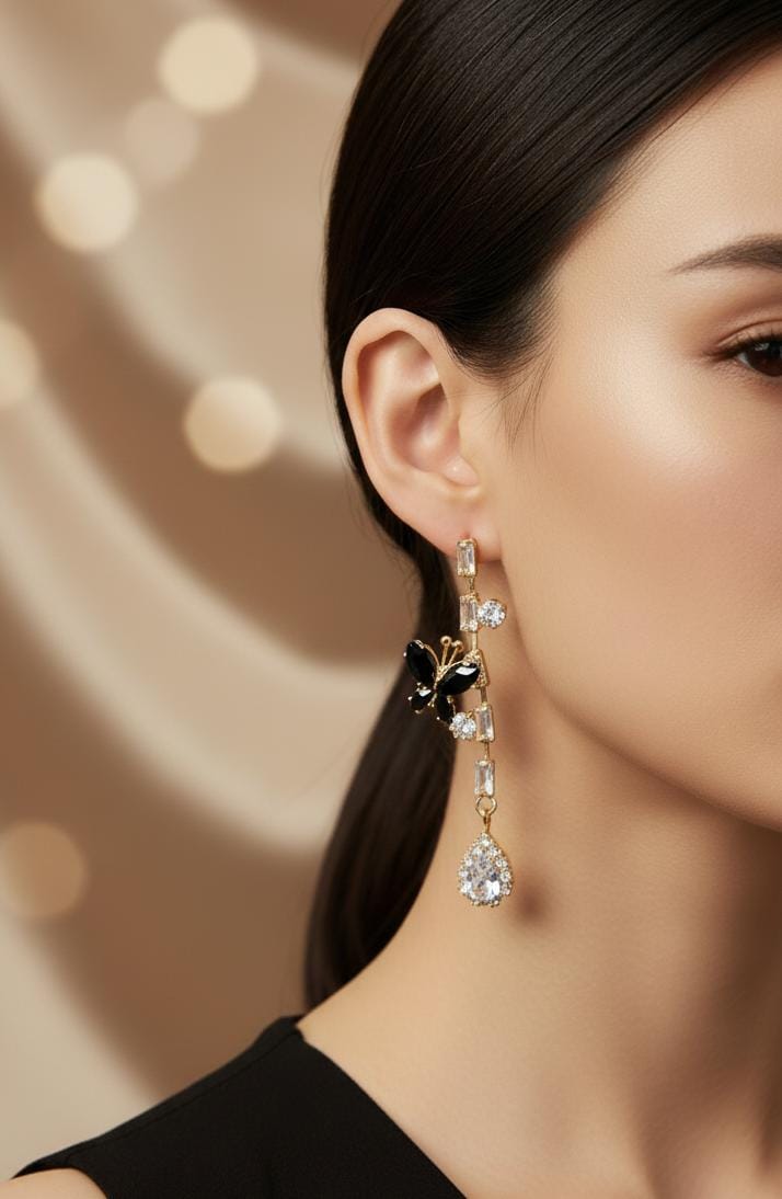 These spectacular dangles begin with a glittering cascade of brilliant-cut stones, guiding the eye down to the centerpiece: a bold, black butterfly. This velvet-winged creature symbolizes transformation and the freedom to pursue your deepest longings. The dramatic drop, finished with a luminous teardrop gem, ensures that with every turn of your head, you cast an unforgettable sparkle.