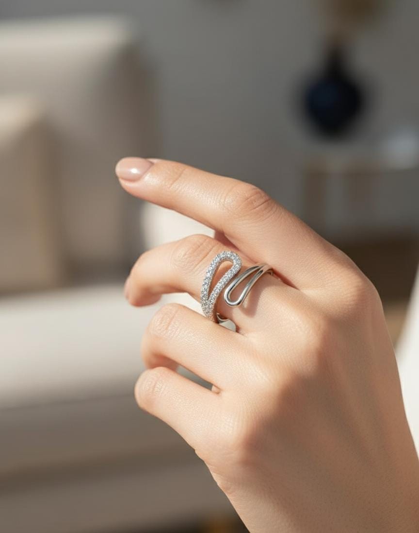 Embrace the feeling of forward motion with the Current Desire Ring, a stunning piece designed for the modern spirit. This ring is a wearable metaphor for the beautiful ebb and flow of life, capturing a moment of pure, dynamic energy.