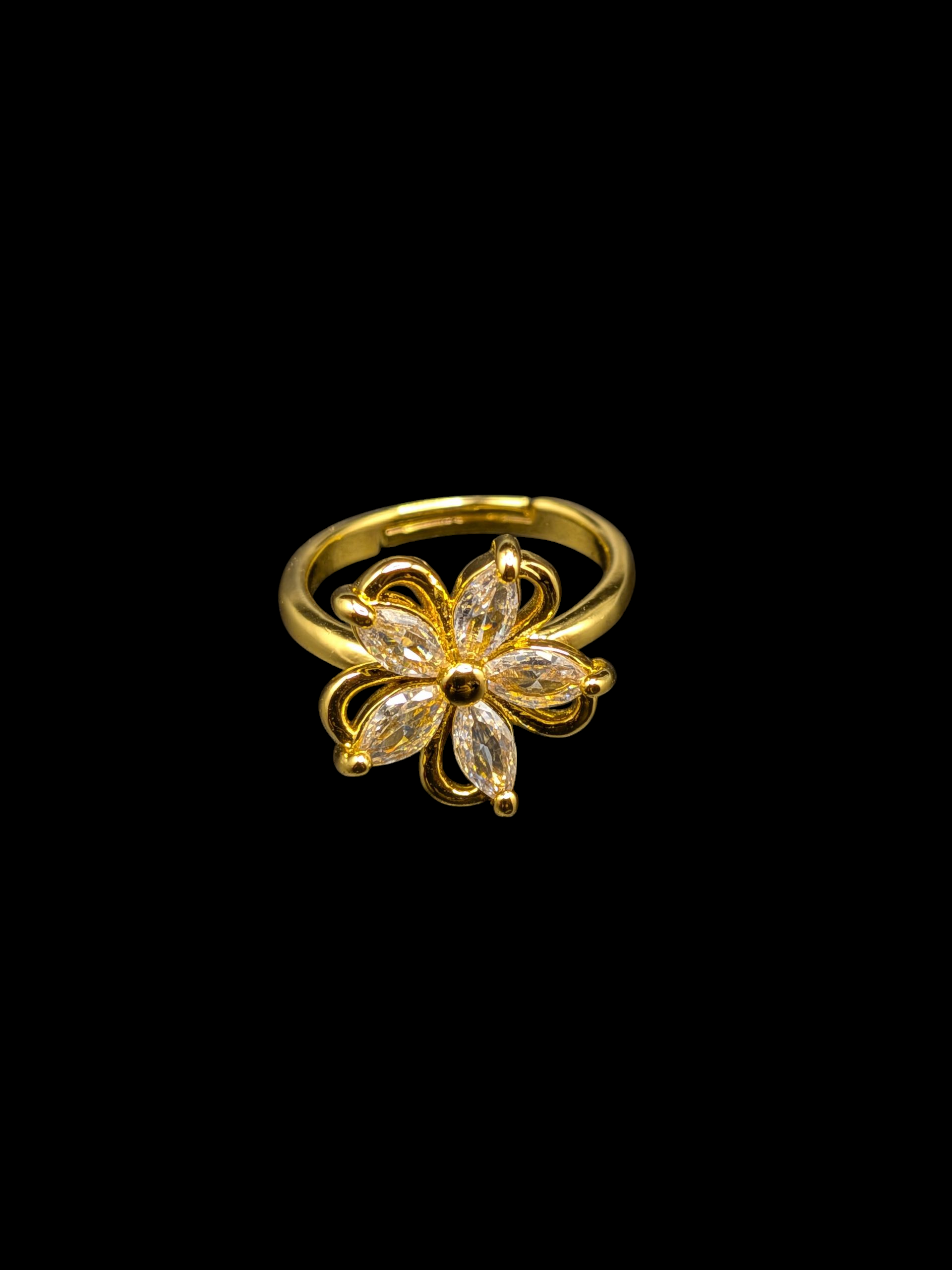 The central design features a single, breathtaking blossom, its six petals formed by sparkling marquise-cut crystals that radiate a soft, gentle light. The rich gold band enhances the delicate structure, creating a piece that feels both luxurious and airy.
