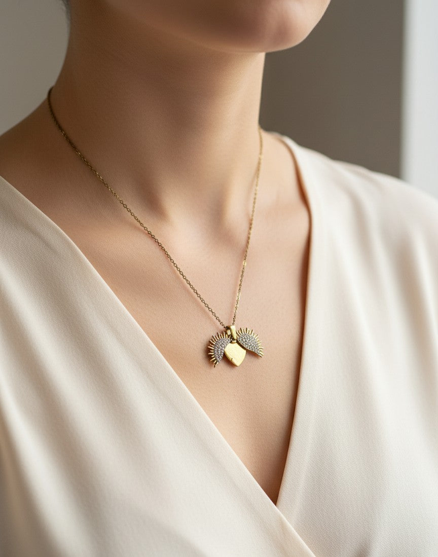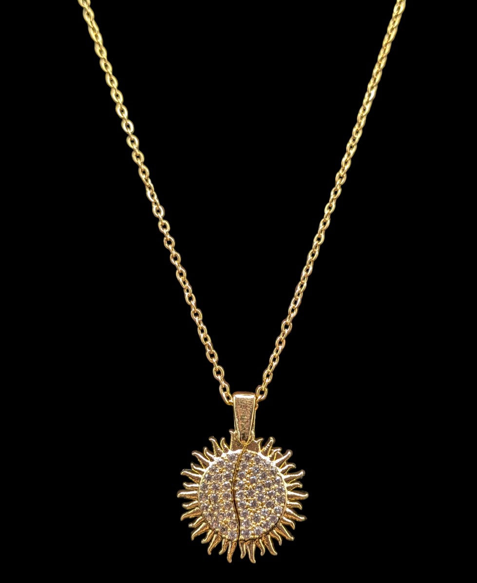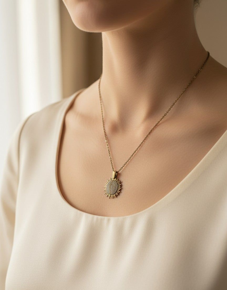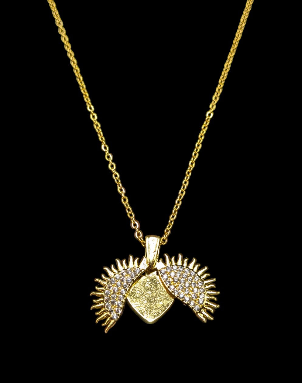 A shimmering symbol of love that shields and shines. The Solar Embrace necklace features a brilliant, pavé-set sun pendant that, at first glance, is pure radiance. But with a gentle touch, it opens to reveal a hidden, polished heart—a precious secret guarded by light. It’s an intimate piece that assures the wearer they are loved, protected, and always cherished, making it the perfect emblem of deep and enduring devotion.