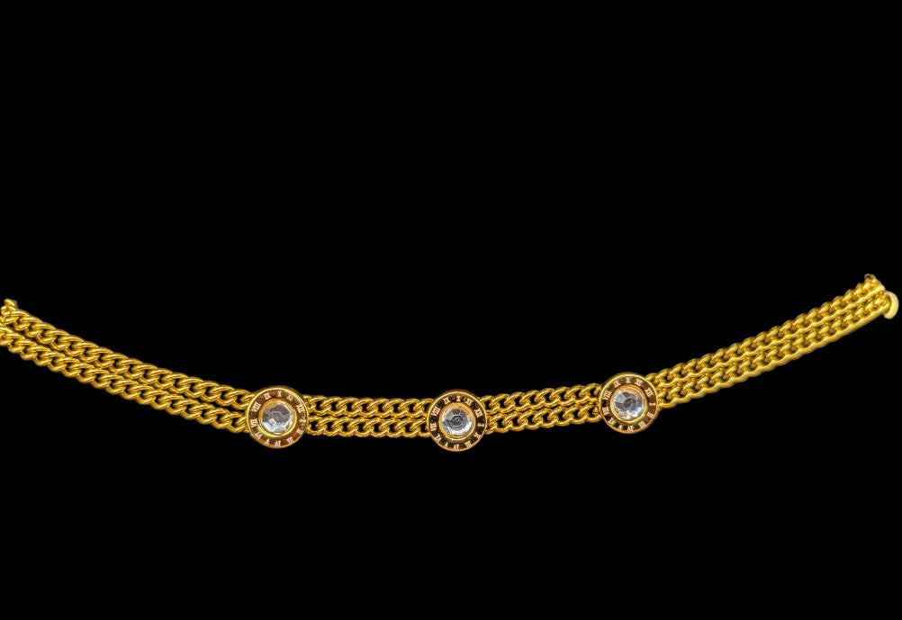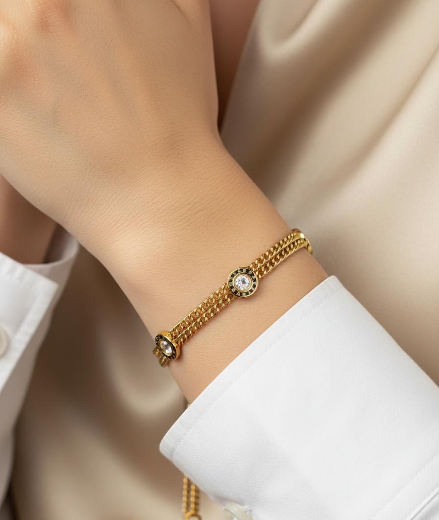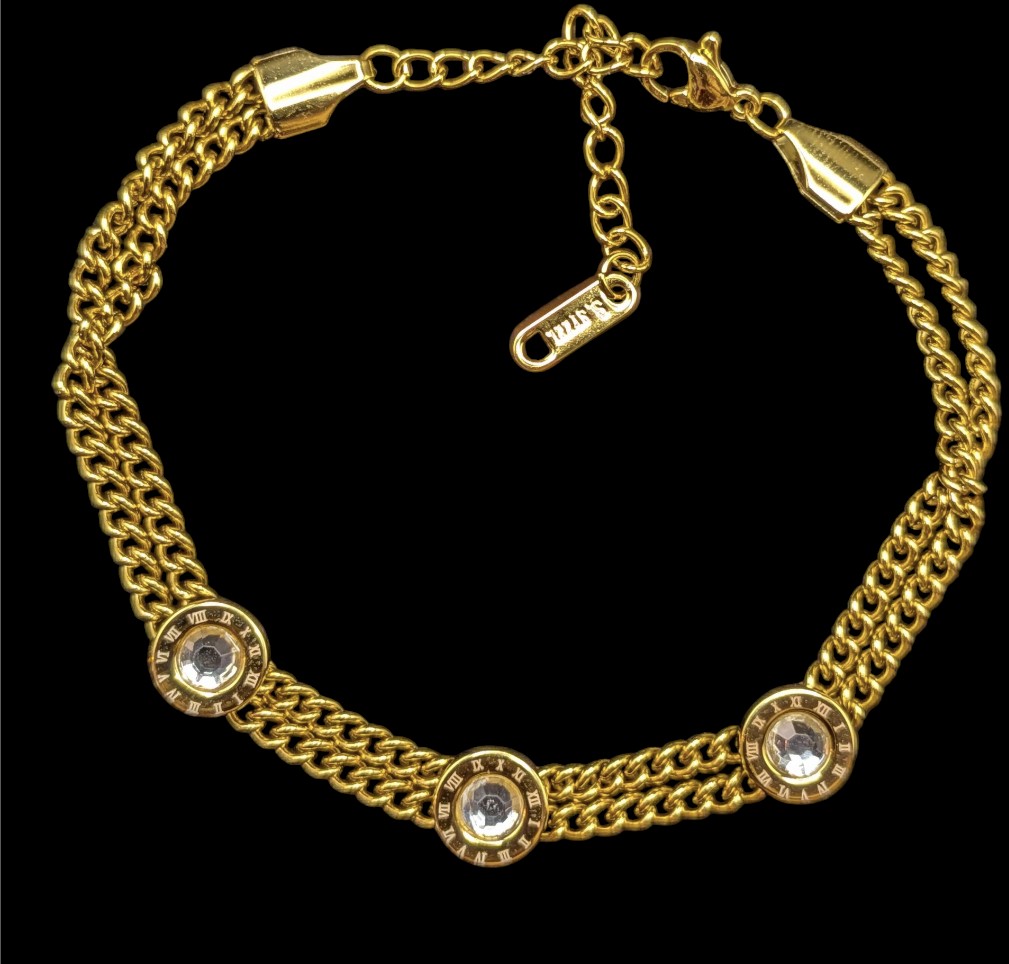 Drape your wrist in the gentle, captivating glow of a midnight sky. This exquisite piece features a shimmering double-chain, elegantly punctuated by three iridescent crystal stations. Each stone is a miniature reflection of the moon, catching the light with a soft, otherworldly gleam. It's not just a beautiful accessory, it's a whisper of starlight and an enduring symbol of timeless elegance."